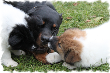 Hierzu steht ein kuscheliges Spielzimmer (...und später auch das ganze Haus!!!) mit vielen Spielzeugen zur Verfügung – obwohl man erwähnen muss, die meiste Zeit spielt es sich am Liebsten mit den Wurfgeschwisterchen, mit Mama Louise oder auch besonders gern mit Hundetante Ronja oder den Schwestern Abigail und Anastasia, die ganz ihrem vorsichtigen Spieltrieb verfallen, sobald sie Welpen erblicken.