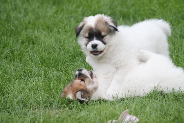 Er hat mittlerweile eine schöne braune Brillenfärbung und wird sicherlich auch bald seine ersten Flecken am Körper bekommen. Er kabbelte sich schon unheimlich gern mit seinen Geschwisterchen mit Bellen und Knurren und natürlich auch zu Anfang noch mit unbeholfenem Umfallen. Es macht sehr viel Spaß unseren Kleinen bei ihren Interaktionen zuzusehen.